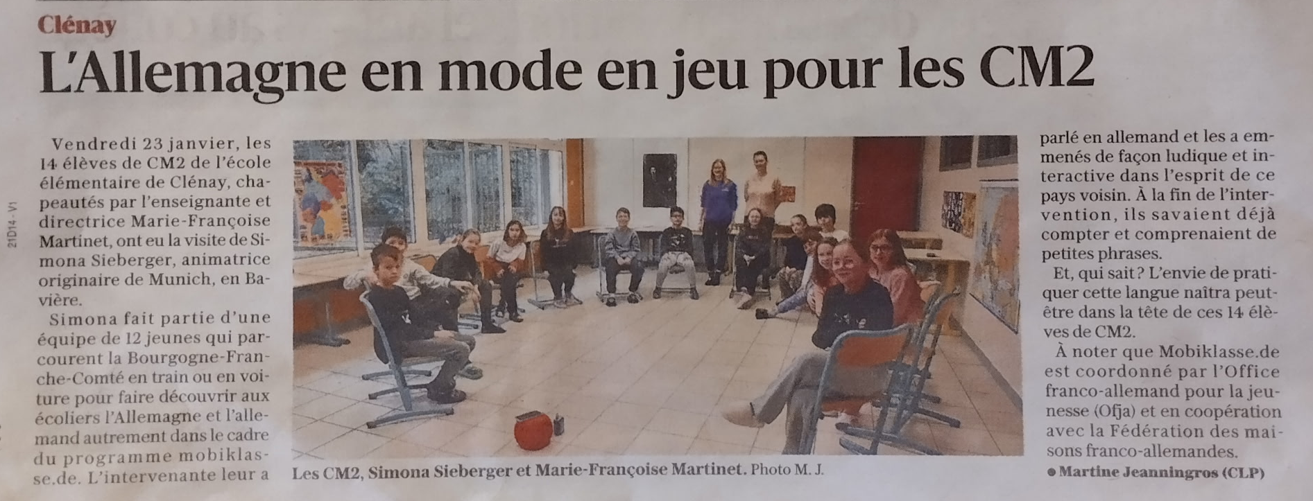 Dans le cadre de la journée franco-allemande en souvenir du traité de l’Élysée entre Charles De Gaulle et Konrad Adenauer du 23 janvier 1963, les élèves de l’école de Clénay ont bénéficié de l’intervention de la liaison de Rhénanie-Palatinat pour promouvoir l’apprentissage de l’allemand au collège.